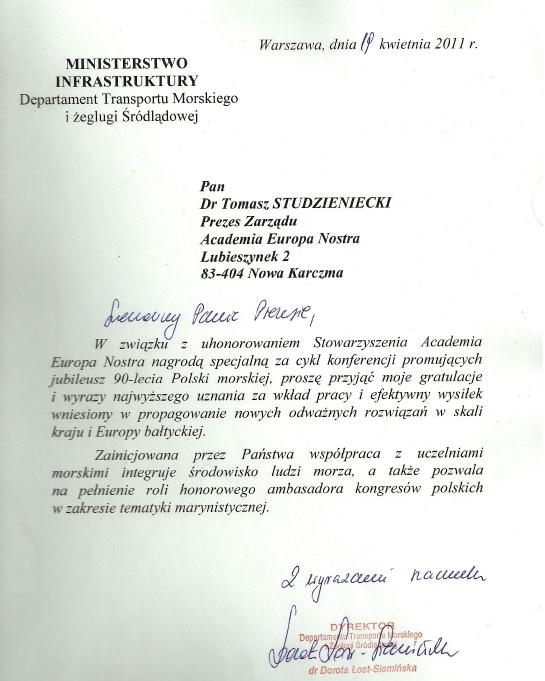 Gratulacje z Ministerstwa Infrastruktury dla Stowarzyszenia Academia Europa Nostra, (kwiecień 2011)